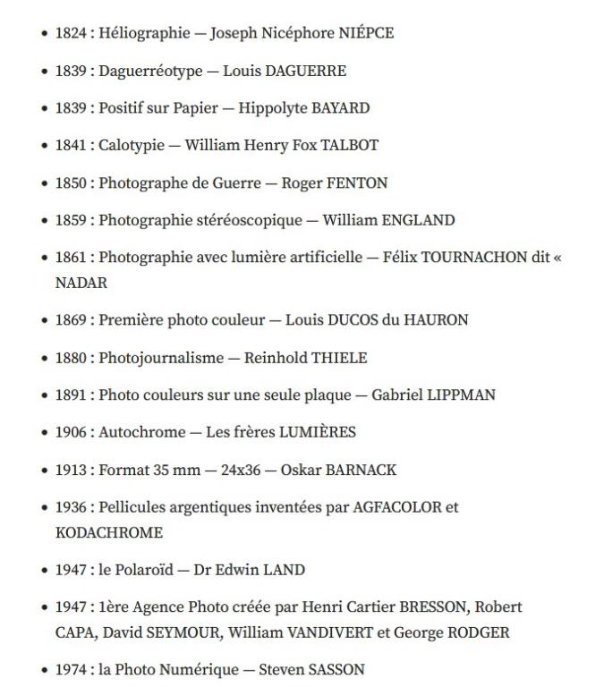 Dates importantes de la photographie. ( source internet )